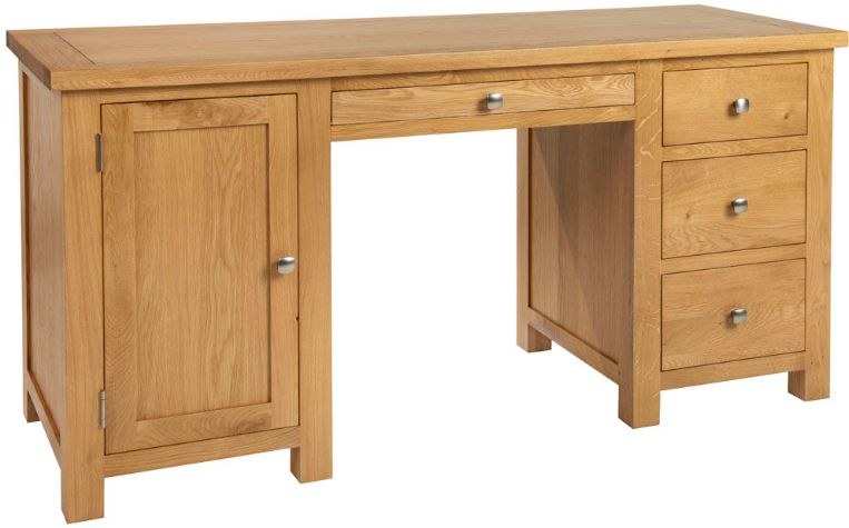 Perfect for creating an efficient and functional home office space, this large desk features a large surface work area, and a narrow drawer for laptop/tablet/paperwork storage over the seating area. To the right, there are three storage drawers and on the left a handy full length cupboard. Need more space? Check out our other desks in the same style to extend your working area. Or add our filing cabinet for further storage.